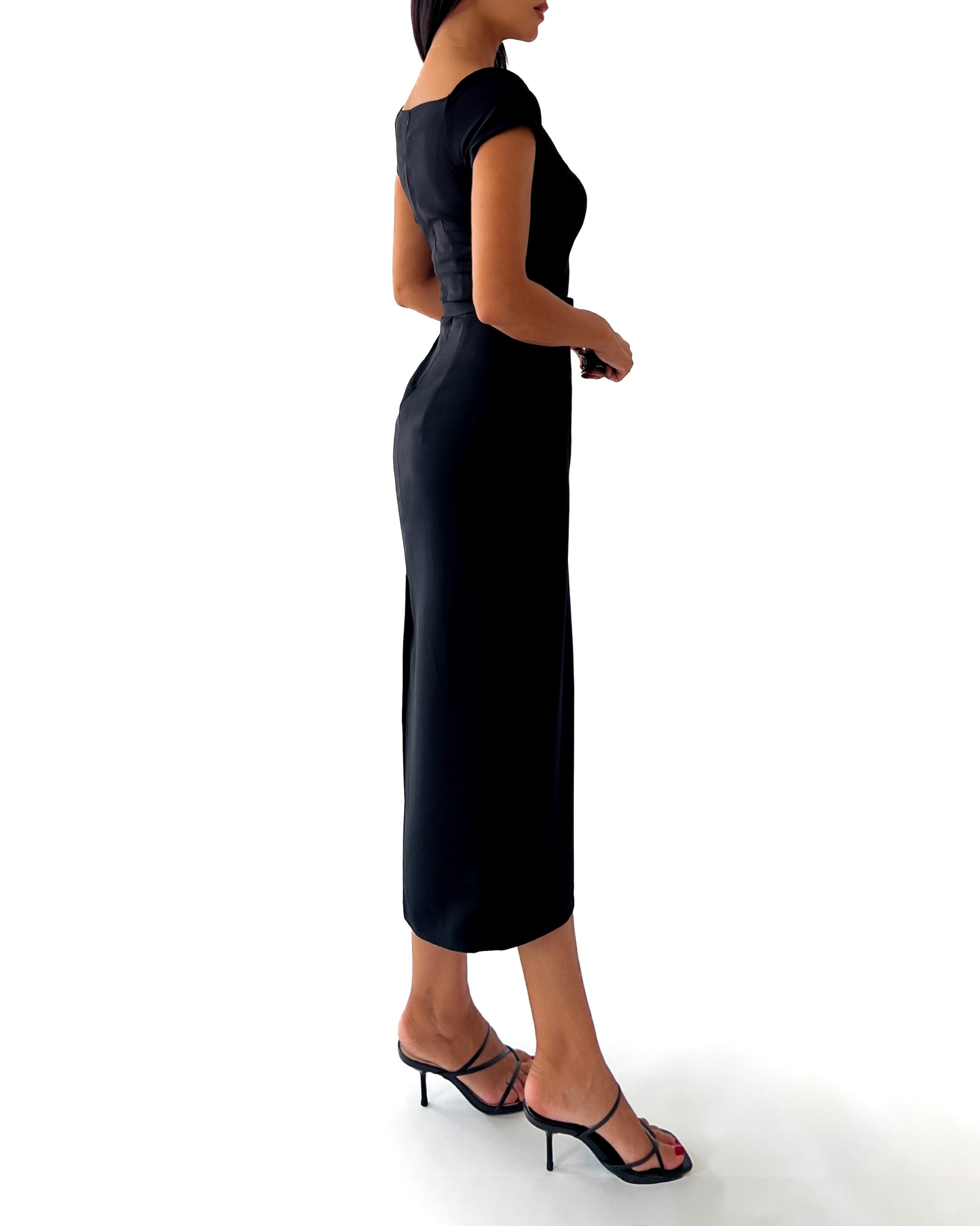 Unveil your inner elegance with the Siren’s Song Dress from our Resort Collection. This captivating black midi-length dress features a charming heart-shaped neckline and short sleeves, combining classic sophistication with a modern flair. The flowing fabric drapes gracefully, creating a silhouette that’s both flattering and timeless.